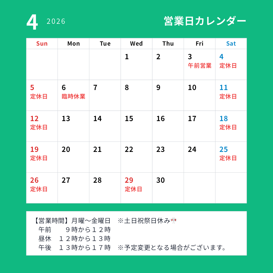 平日(月曜日~金曜日)9時00分~17時00分(※臨時休業有り) 土日祝祭日休業